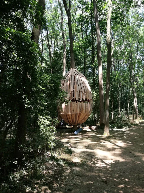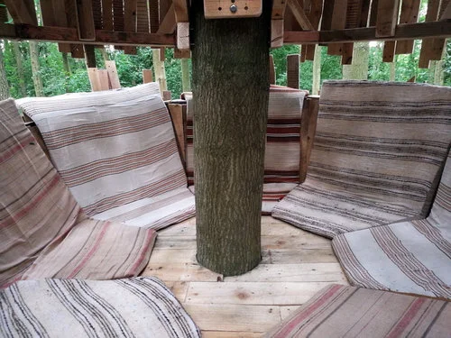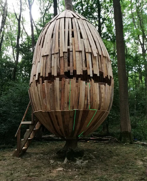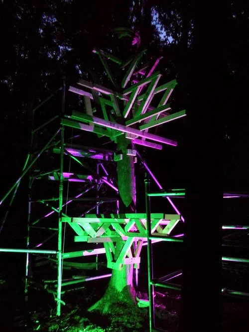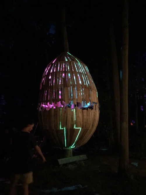Rebirth (aka The Egg) was created from scratch in 6 (long) days and is made entirely from recycled materials, it is built directly onto the tree and contains a seating pod with space for around 7 to relax and chill after a boogie at the stages. LED's light up the surrounding trees and creates the illusion of a floating cracked egg.